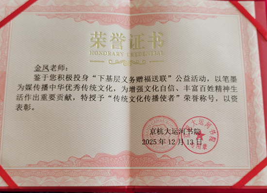 2025年12月13日,名家艺韵创始人金凤女士携爱心奔赴北京市通州区里二泗村,参与“下基层义务赠福送联”公益活动:挥毫写福传递暖意,以笔墨为桥播撒传统文化火种,既献爱心又传文脉,更获“传统文化传播使者”荣誉,墨香裹着温情,让文化暖意沁润人心。