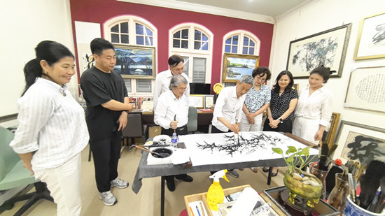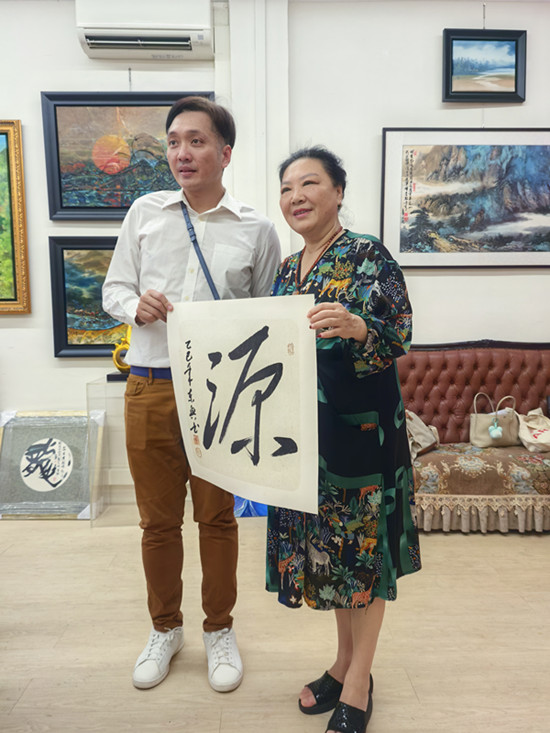 笔会雅集中,邓文章先生挥毫泼墨,一幅《惠风和畅》笔力遒劲、意韵悠长;赵俊贞老师的墨竹图则以浓淡虚实的笔墨,写尽君子风骨。满座宾朋围坐长桌,茶果相伴,在笑语盈盈间,让东方的审美意趣与南洋的包容气质自然交融。他们也有幸获赠著名民族艺术家康书贵先生书写“佛”青年书法家佟东兴书写的“源”等书法作品,一笔一划里皆是文化传承的厚重与祝福的温度。