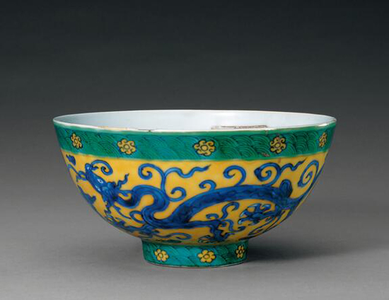碗敞口、深弧壁、圈足。内施白釉无纹饰。外壁口沿及足墙均以绿釉为地,绿釉地上以青花、黄彩描绘落花流水图。腹部以浇黄釉地青花双螭龙纹装饰,衬以云纹。圈足内施白釉。外底署青花楷体“正德年制”四字双行外围双圈仿款。
