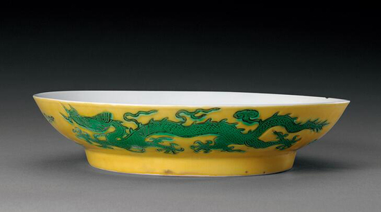 盘敞口、浅弧壁、圈足。内施白釉无纹饰。外壁黄地绿彩锥拱云龙纹装饰。圈足内施白釉。外底署青花楷体“大明正德年制”六字双行外围双圈仿款。