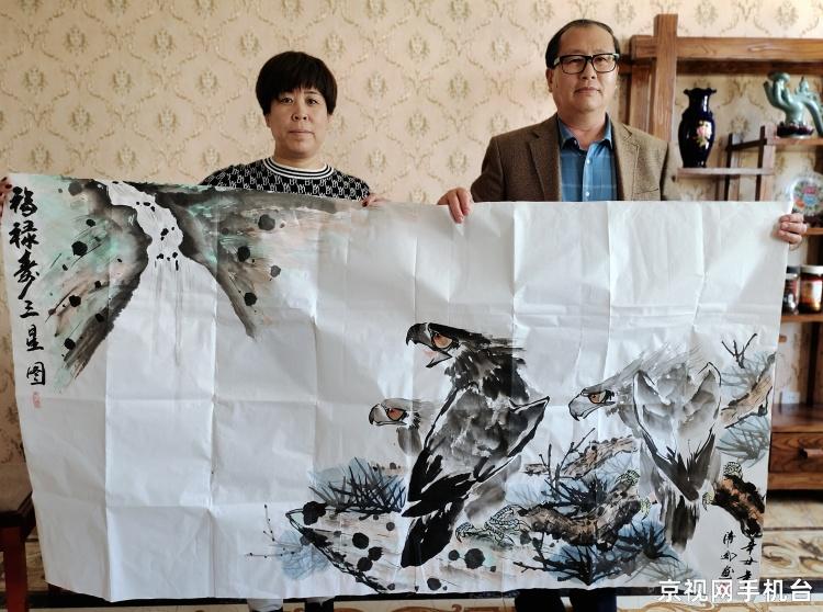 京视网手机台(名家艺韵)频道总编辑金凤代爱心艺术家战国权捐赠墨宝。今天聚集在一起的这几位艺术家都是随捐一百家敬老院的奉献者,是爱心奉献让大家凝聚在一起。