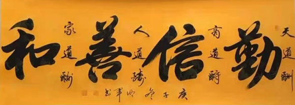 2013年其作品"勤信善和" 字体遒劲,内涵丰富,荣获"国际孔子书画展"金奖"。