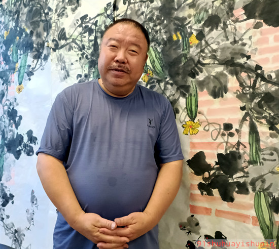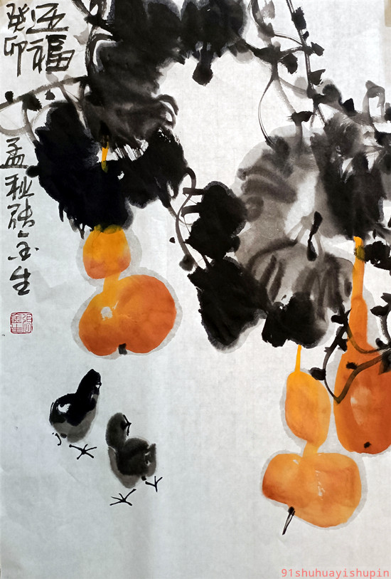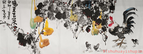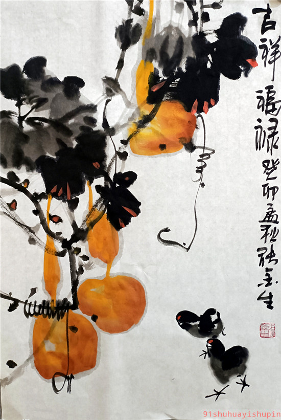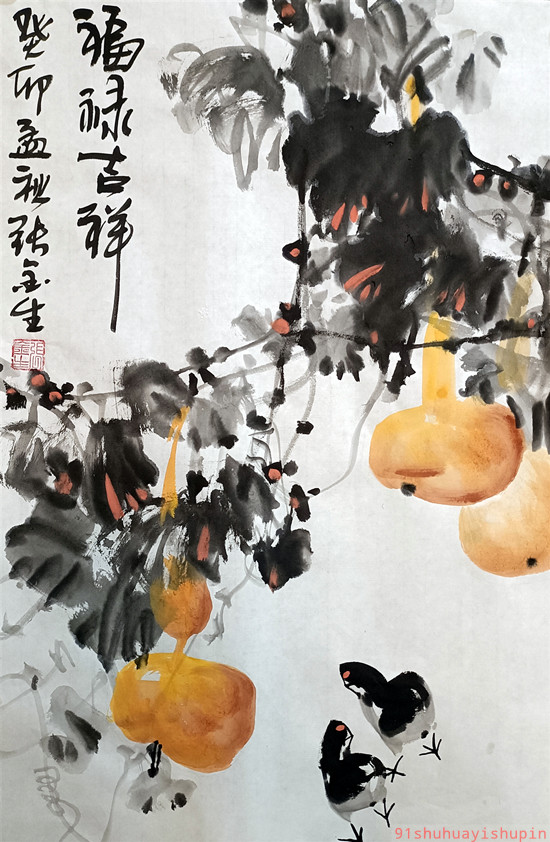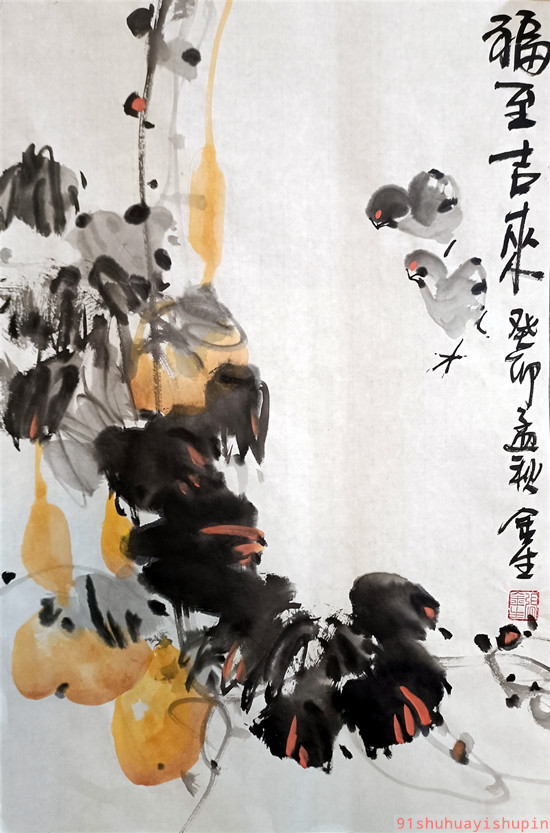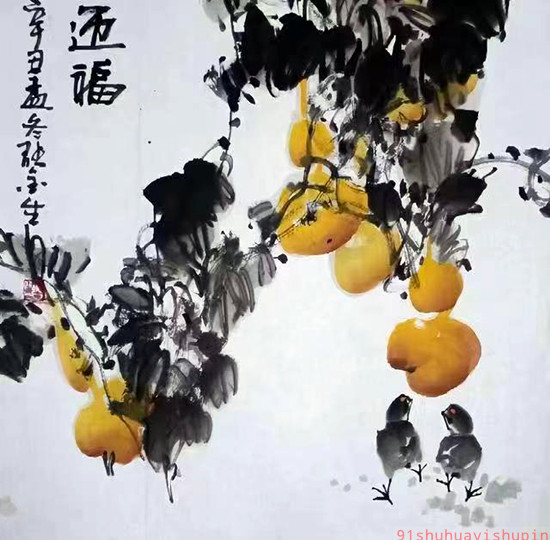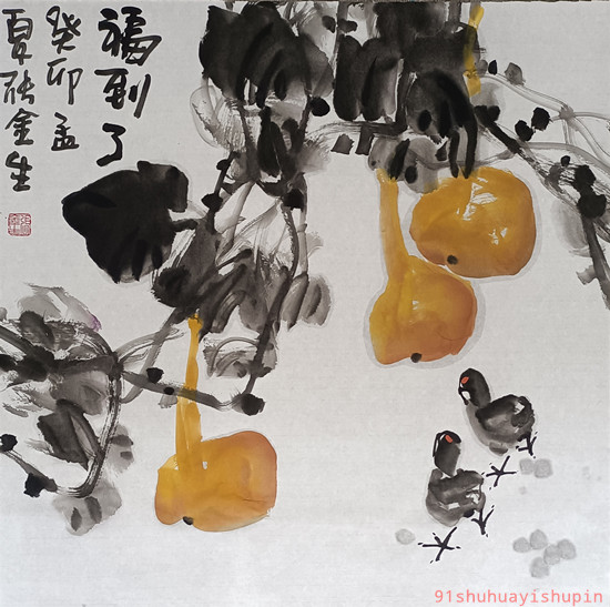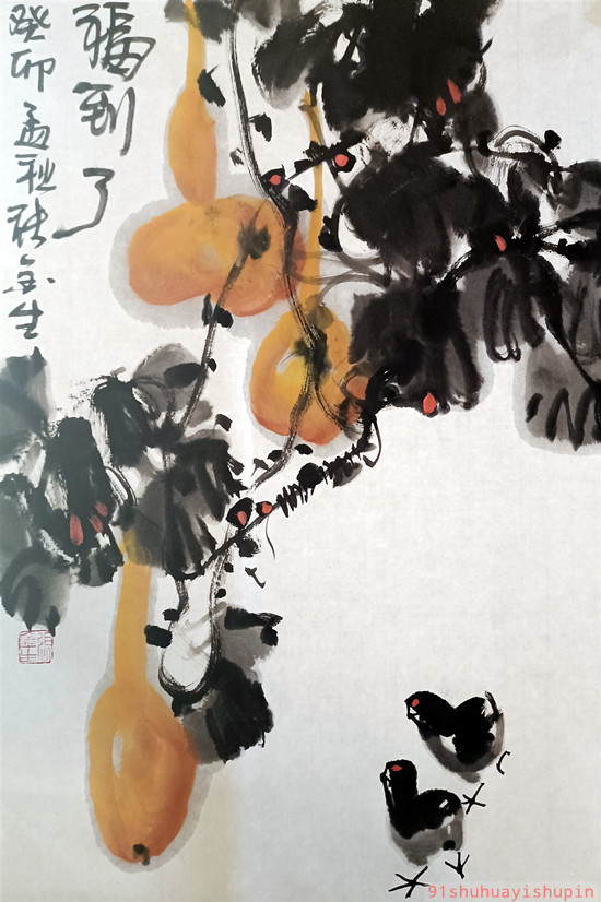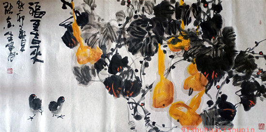 在国画中,“葫芦”与“福禄”谐音,是福禄双全的象征,民间常被称作招财纳福吉祥物,据传说中家家户户都悬挂葫芦画,能给家中带来好运,祈求全家平安健康等,是开运吉祥物。葫芦,嘴小肚大,形体优美,色黄如金,为大众喜爱,名家推崇。葫芦的文学,艺术,民俗和神话传说自成一体,构成中国传统文化的重要组成部分。葫芦,爱生长、能蔓延、多果实,于是人们赋予它丰富的文化内涵。它也成为大家心目中增寿、降瑞、除邪、保福的吉祥物。不仅普通百姓喜欢葫芦,还有许多画家也偏爱它,画葫芦就是画如意、画平安。葫芦是非常适宜表现意趣的题材,不仅长得恣肆烂漫,还寓意美好,所以葫芦题材虽传统,但也足以表现个人意趣。今天,和大家一起欣赏著名画家张金生画笔下的水墨葫芦系列图,定会给大家带来福禄双收的愉快与喜悦。藤本植物是张金生最为擅长的题材,尤其是他笔下的葫芦,令人印象深刻。他作画重气势,绘葫芦更是凭藉那一手极具金石意味的草篆笔法写藤蔓,盘纡缭绕,气机畅旺,画到兴致上,所绘葫芦更是“得意忘形”之态,最为传神。他常常给自己所画葫芦取名“依样”,旧谚谓“依样画葫芦”。张金生葫芦画设色古朴,用笔豪放,充分表现了他古拙、浑厚、豪迈的画风。张金生的葫芦画不仅精彩在葫芦上,有时题款更能起到画龙点睛的作用。他的这幅《迎福》,构图呈半弧形,花叶藤蔓依势而下,上密下疏,几欲撑满全纸,五只葫芦各择其位,画幅下端那只垂枝往下,勃勃生机也。藤蔓于此处弯环向上,为全图形成俯仰顾盼态势,既合物理,又合画理。不经意间已为题款留出位置,十四个字分列三行,笔墨浓淡、字体大小、经营位置,恰到好处;他的《福至吉来》中,主体物在画面的上端和中部抱团集中,末了,象征性地扫了两笔藤须,避免了集中而带来的凝滞感受,为灵动之气制造了一个出口,整体呈倒三角之势,中心线与对角线重合,自上而下喷薄而出,处处透露了璞玉浑金的艺术才情。画中的五言诗款识,更使《葫芦图》“诗中有画,画中有诗”,意境深远;他的《福禄临门》用鹅黄色没骨画法,颜色艳丽明快,在墨色厚重的大片叶子的衬托下,形成对比,使画面十分鲜亮。整幅画以淡墨枯笔将藤蔓肆意缠绕,气韵生动,墨趣横生;他的《聚福》写葫芦大藤,尽显以草隶之笔入画的气势。他以泼墨写叶,浓墨勾叶筋,淡墨写葫芦。而盘旋往复、贯通全画的则是以书入画的大藤,它是此画的血脉,画因它的流动而生意盎然。在疏密虚实的处理上,他尤具苦心,实处密不透风,虚处中疏通透,如此才使疏密得当、虚实相生,生意盎然。《吉祥福禄》为张金生大写意丈二匹绘画之精品,不论是构图、行笔、着色,皆传神高妙。此图以泼墨写叶,不着墨线勾筋写脉,笔法简洁传神,墨色酣畅淋漓。葫芦与“福禄”谐音,正合“福禄双全”的吉祥寓意。葫芦之黄色艳彩与浓淡墨色交相辉映,以焦墨渴笔写藤,宛转如飞,似游龙入江,挥洒自如,气韵充盈笔端。这幅葫芦,最绝的是藤蔓,用笔用墨已经是天籁,是神在走,而不是手在走,笔墨中包孕的精气神完全超越了他的身体健康的状态,是修养在完全自由、自然、自在、自为的状态下的释放。张金生的葫芦看着并不那般怪,因为他认为,葫芦和葫芦藤本身就有个“好样”,所以“万事不如依样好”,创作大画中不必求奇求怪。这不但是张金生的艺术心得,更是其独特的人生感悟。张金生画此大幅葫芦以黄葫芦、墨叶的组合方式为多,他的这幅巨作正体现出他典型的艺术特色。浓艳的柠檬黄和厚重的墨叶形成强烈反差,使画面气氛十分热烈;他以流畅的用笔和没骨法表现葫芦,不加任何皴染,以优美的曲线和鲜艳的色彩取胜;葫芦的阔叶纯以墨笔写出,叶片的向背、深浅甚至叶脉都在墨色的浓淡里活脱脱地表现出来,体现出其独特的墨法特点,特别是藤下面一群纯水墨表现的小鸡与葫芦相互映辉,将大作的品位彰显得淋漓尽致。张金生擅长葫芦下画小鸡,他笔下的小鸡,原型也是那些普通的家禽,而经他精心润笔运笔施墨后而就成为生动美丽的艺术作品。他笔下的“小鸡”,或其造型夸张,施以大笔,笔墨淋漓,红点铁嘴,线条简练、意象与符号相融,剽悍雄强,风骨遒劲,像鹰一样有力度。或来一群“全家福”,或来一群“五子登科”令人耳目一新,无限遐想。或肥壮羽丰、昂然剽悍;或长颈瘦身,赳赳蹈厉;或昂首天外,或低眉内视;或高歌引吭,或浅唱轻吟;或雄健霸气,或桀骜不群;或倚花长鸣,或与石同坐,或伴风而舞……他笔下的“小鸡”,头顶红点,目光精锐,爪如盘卧金龙,仿佛似随时就能振翅凌云一般的气概。这些不一而足的生命存在,已经超越了“小鸡”的本来意义。张金生对“小鸡”的描述和表达,常常进行灵魂的抽象,并在特殊的故意之下,表达着他灵魂深处的赞美与歌唱。那些或粗犷野达、或细腻缜思、或奇妙无言、或铺张渲泄的艺术探索,留下了不同模样的生命状态,表达着原初的灵魂追索,也寻找着艺术家灵魂表达的最佳样式。张金生以自己独特的笔触和视角,在灵魂与精神的自我完善中,以高冠岌岌的姿态,在艺术世界的求索道路上不断创造、不断出彩出新。他在用笔墨倾诉,用色彩歌唱,使葫芦“小鸡”结合相得益彰,妙趣横生,令人叫绝。本文作者张本平系中国美术家协会会员,中国书法家协会会员,中国作家协会会员,中国文艺评论家协会会员,中原美术学