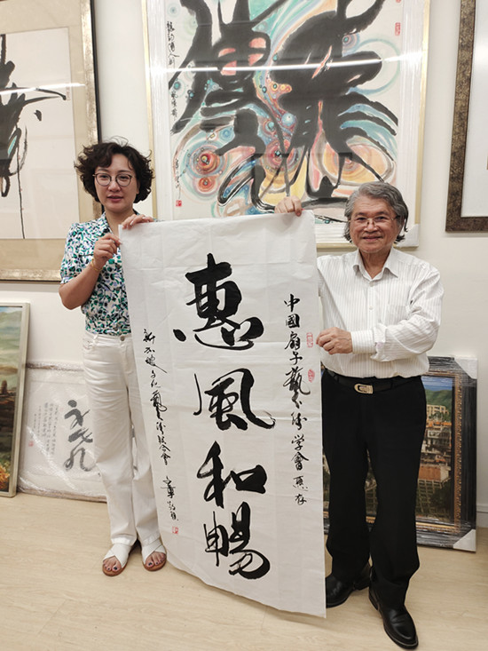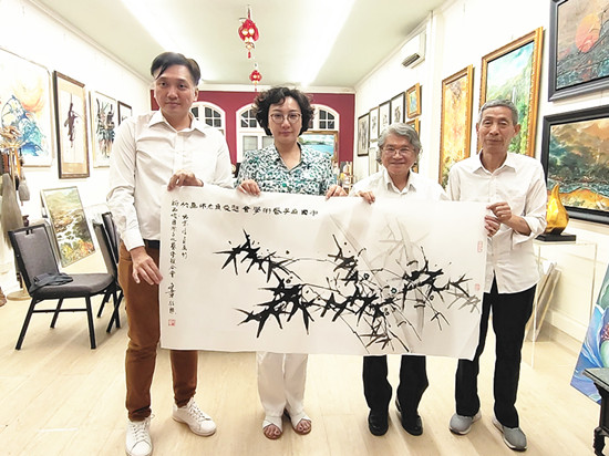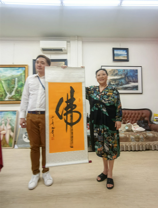 笔会雅集中,邓文章先生挥毫泼墨,一幅《惠风和畅》笔力遒劲、意韵悠长;赵俊贞老师的墨竹图则以浓淡虚实的笔墨,写尽君子风骨。满座宾朋围坐长桌,茶果相伴,在笑语盈盈间,让东方的审美意趣与南洋的包容气质自然交融。他们也有幸获赠著名民族艺术家康书贵先生书写“佛”青年书法家佟东兴书写的“源”等书法作品,一笔一划里皆是文化传承的厚重与祝福的温度。